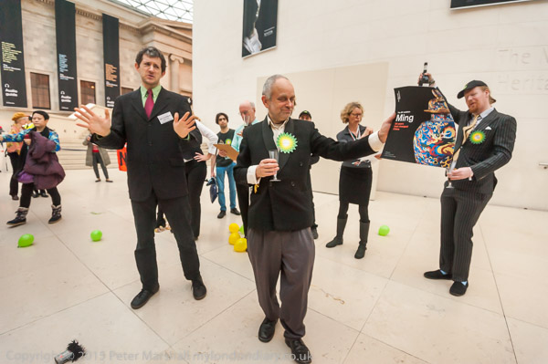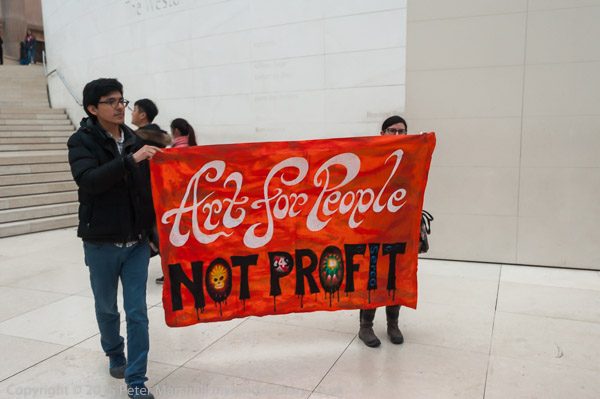 'Art for People - Not Profit' banner in the Great Hall of the British Museum