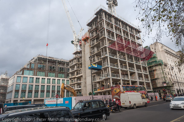 ![]() Stratford ![]() ![]() Stratford Bus Station ![]() ![]() Royal Air Force Bomber Command Memorial ![]() sculptor Philip Jackson represents a bomber crew on their return from a mission ![]() ![]() The memorial was opened in 2012. ![]() ![]() There was no memorial before this as many felt that the bombing of civilians was a war crime, whether by Germans or British etc. There is particular criticism of the raids towards the end of the war aimed at flattening large areas of German cities rather than at particular military targets. The memorial is supposed to be for as well as civilians of all nations killed during raids as well as the aircrew, but it is hard to see that it is so. ![]() The top of the building housing the Hard Rock Cafe overlooks Green Park. It was apparently built in 1905 as a car showroom possibly selling Rolls-Royce motors, but I can find no record on-line to confirm this,, nor any explanation of the monogram which seems to include the letters D, J and L. ![]() Men were gilding the gates to Green Park - pressing down gold leaf onto them. The streets of London may not be paved ![]() with gold, but these park gates have some on them. It's real gold, though so thin you can see light through it. ![]() Boring new buildings replace boring old ones on Piccadilly |