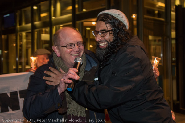 Shaker Aamer hugs a campaigner from Wandsworth where he lives