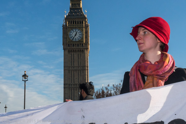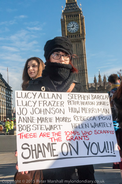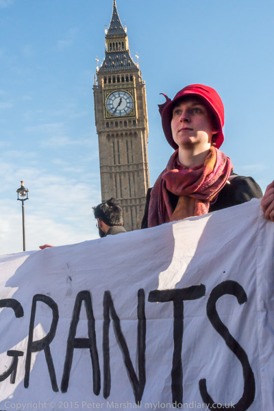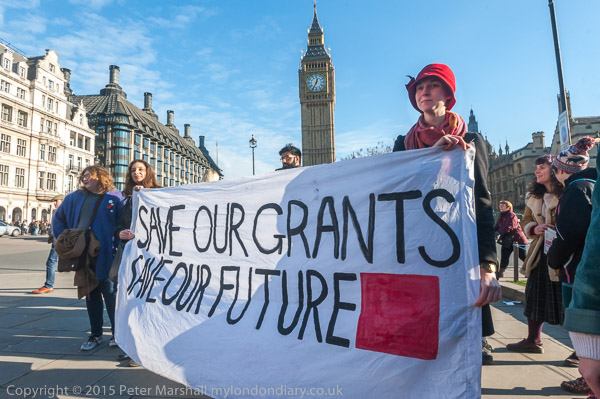 'Save Our Grants - Save Our Future' banner in Parliament Square in front of Big Ben