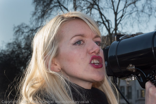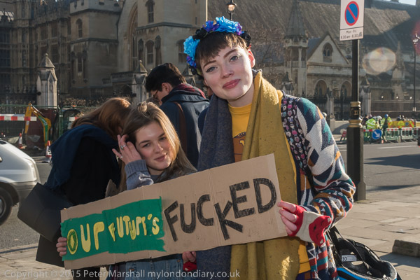 Four protesters carrying the David Bowie lyrics from 'Changes': 'And these children that you spat on as they try to change their worlds