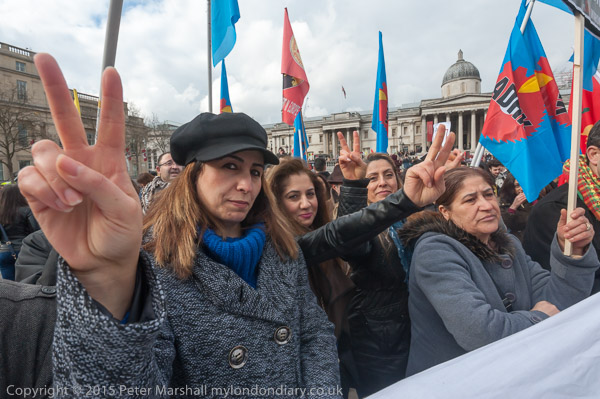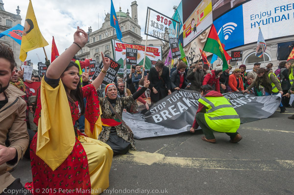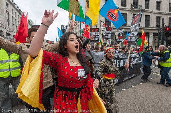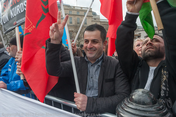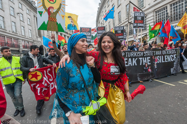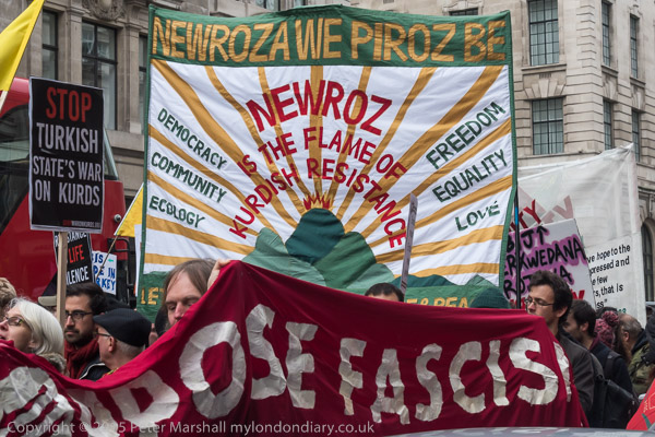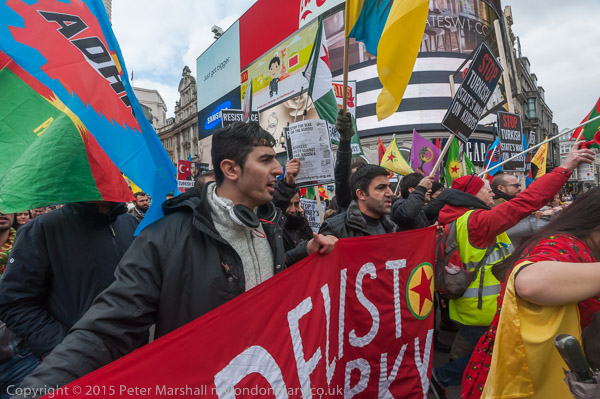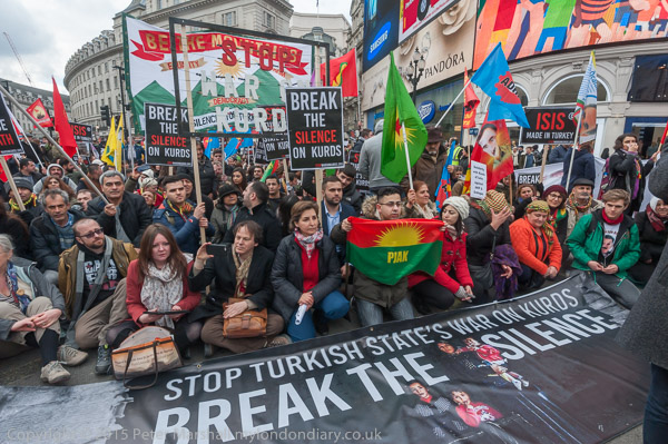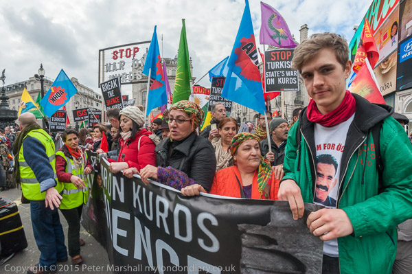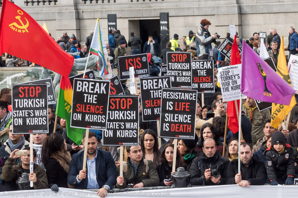 The front of the march with the banner ''Stop Turkish State's War on Kurds Break the silence on Kurds'