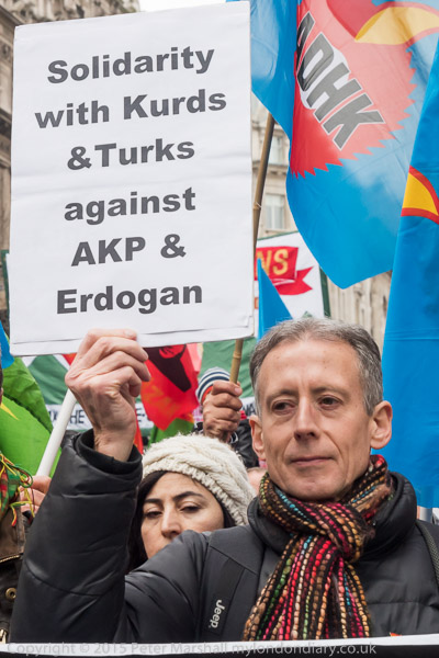 Peter Tatchell holds a poster 'Solidarity with Kurds & Turks against AKP & Erdogan'