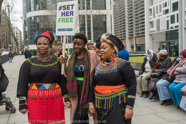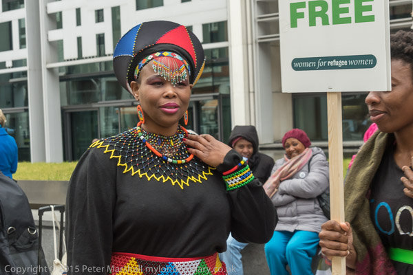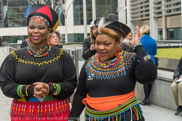 African dancers wait to perform - and a woman gets afriend to take a photograph o f her with them