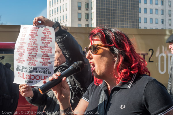 holding up a long list of 'Just some of the London estates socially cleansed by Labour councils'