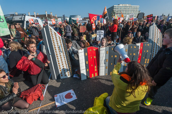 A wall of housing shields in front of people sitting on the road to block Westminster Bridge