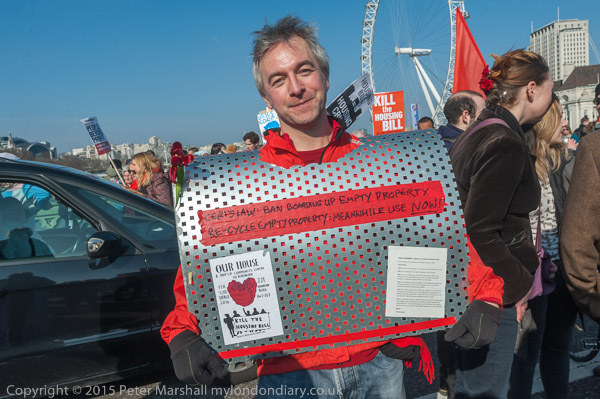 'Ceri's Law: Ban Boarding Up Empty Property - Re-Cycle Empty Property : Meanwhile Use Now' A protester from Our House, an empty