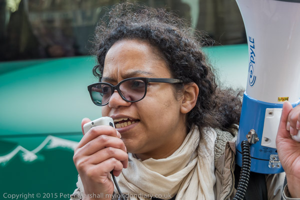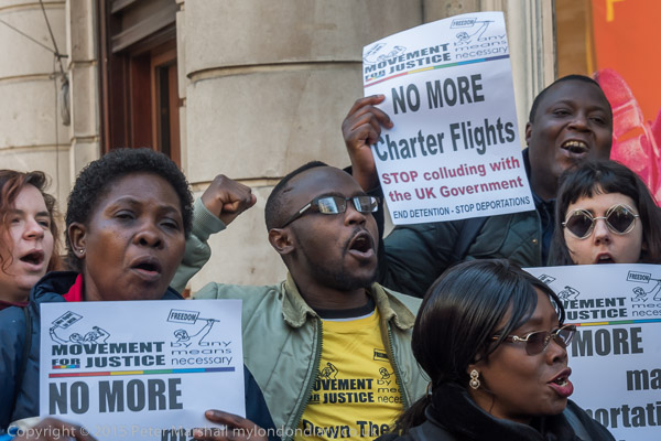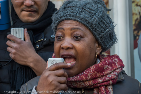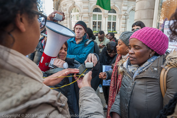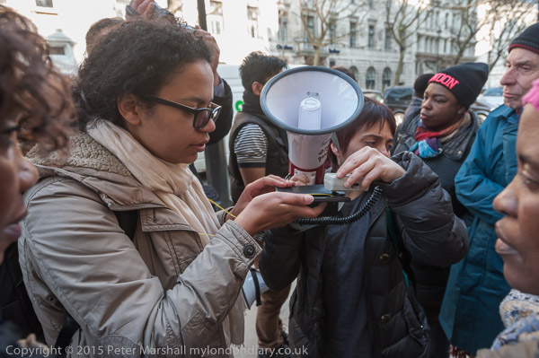 A phone converstaion from someone in Yarls Wood is relayed over the megaphone