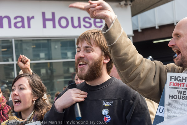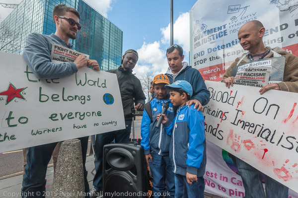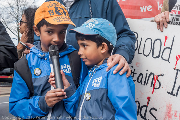 Two young boys chant some slogans at the protest. Their family has suffered several evictions and may face