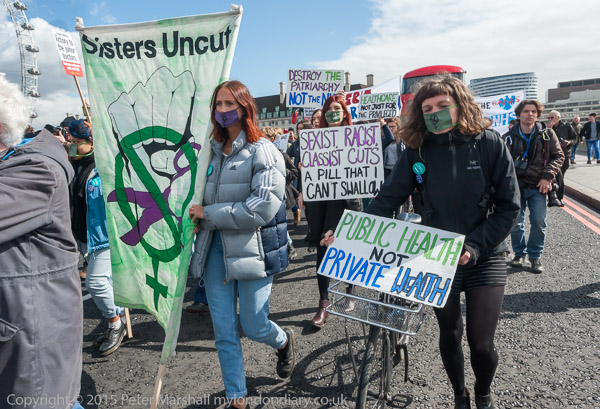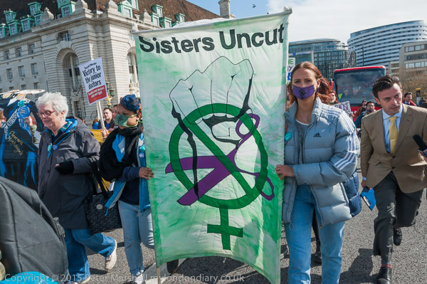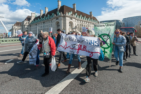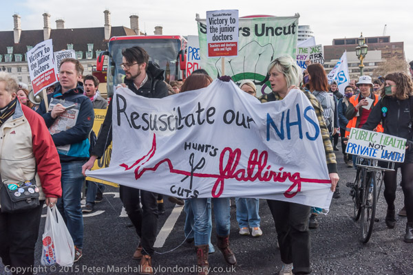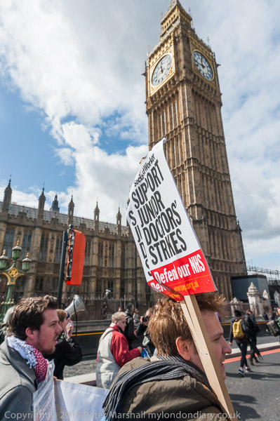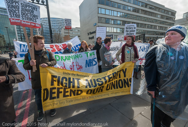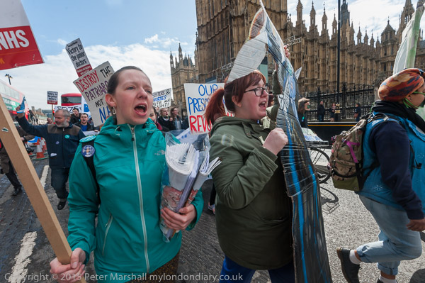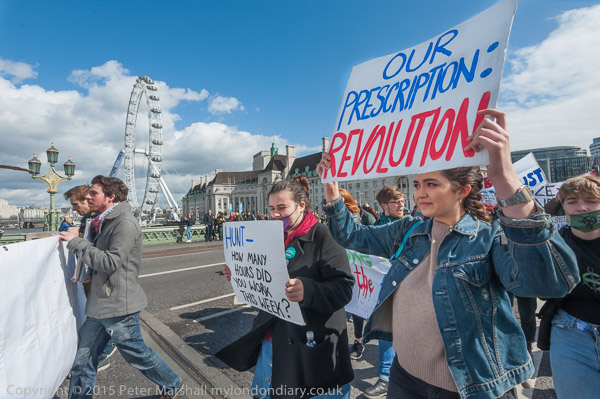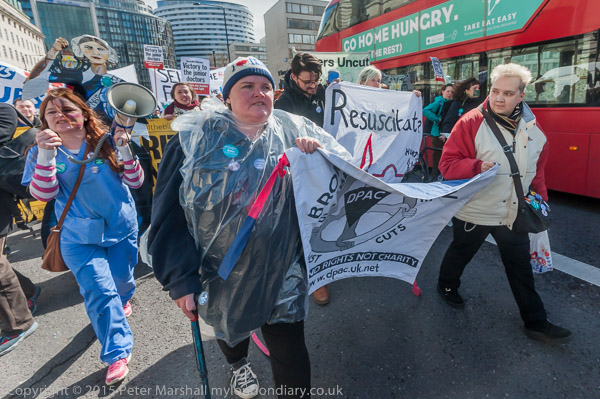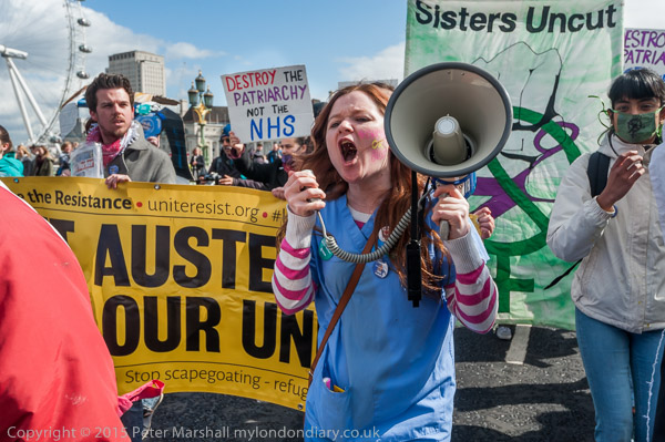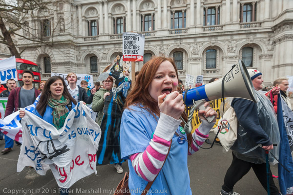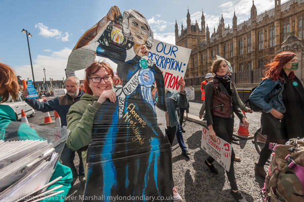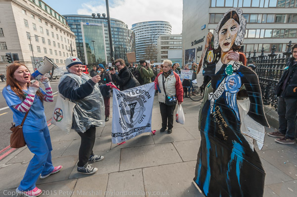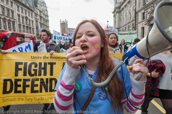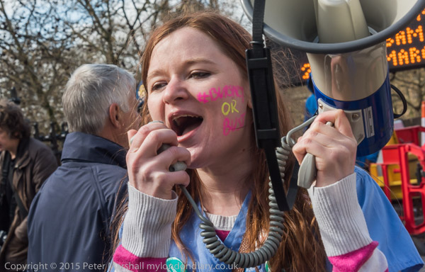 Danielle of BursaryOrBust calls for the march to the Dept of Health to start. 'Florence Nightingale' is already waiting to go