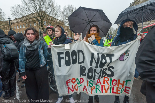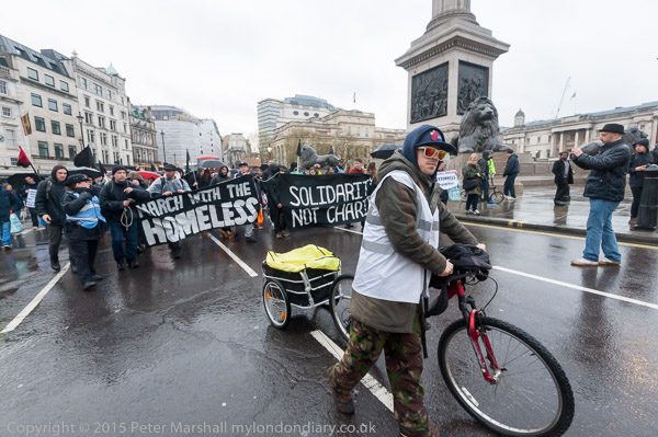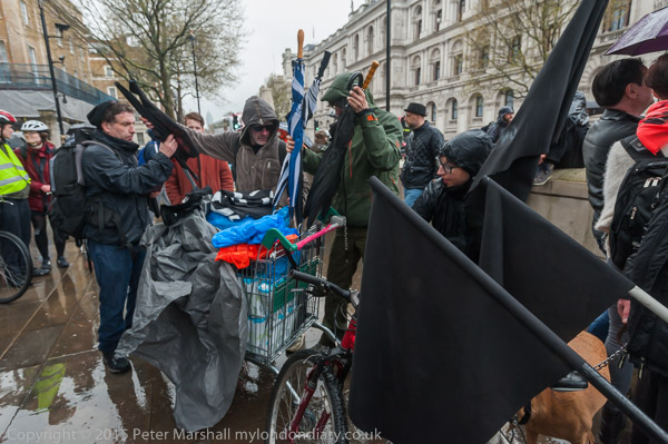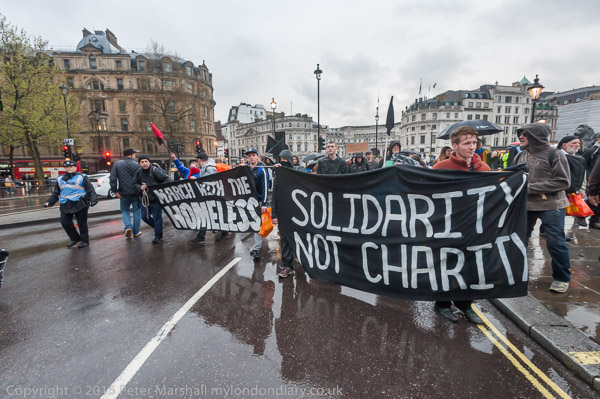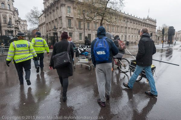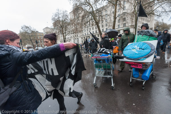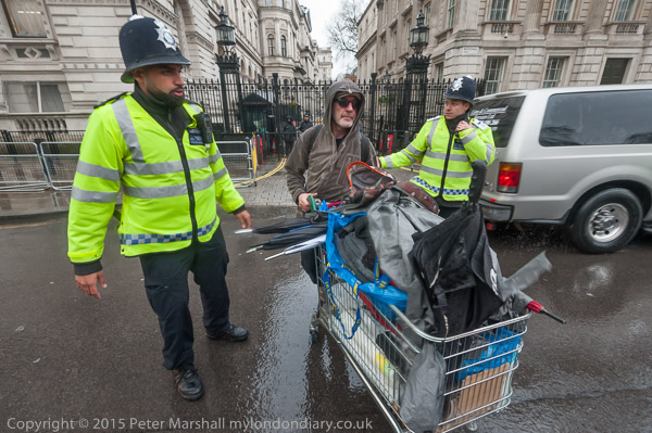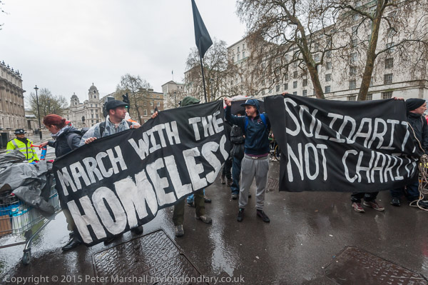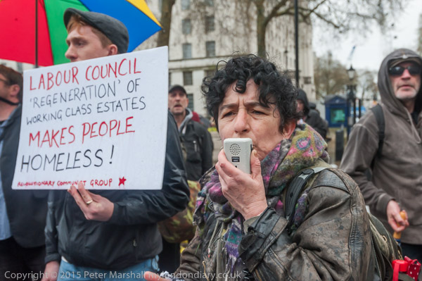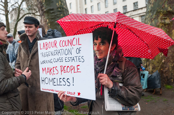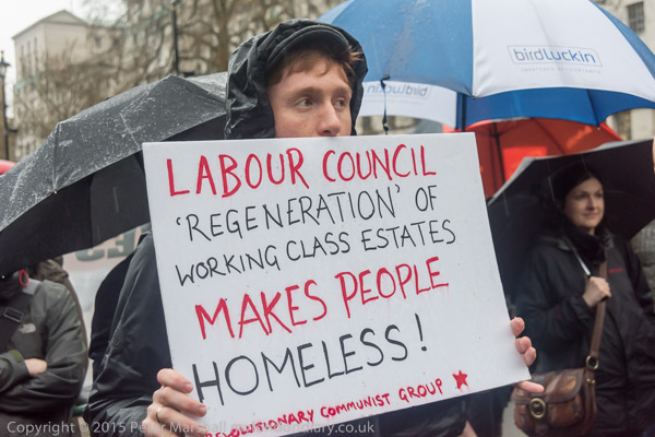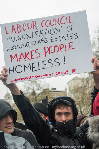 People meet up at Downing St. A poster says Labour Council's 'Regeneration' of working class estates makes people homeless!