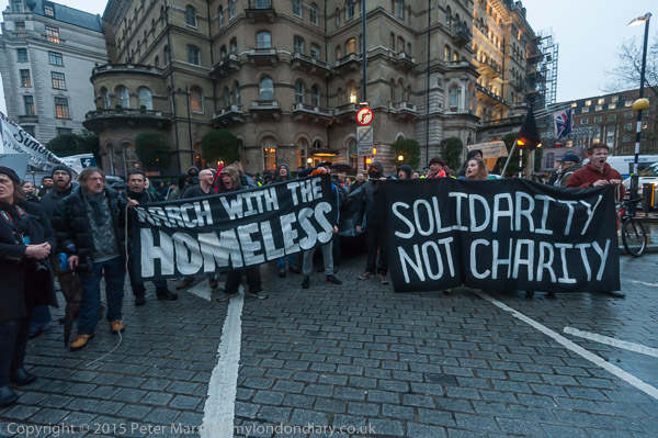 Which was protected by a line of police. A woman holds up a sign 'Where is the Care for our Homeless Brothers and Sisters'.