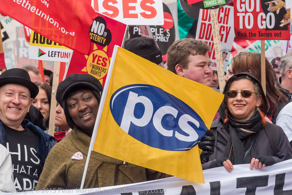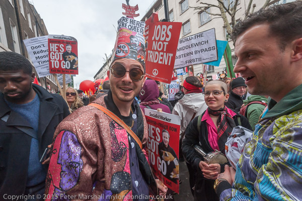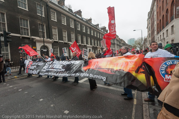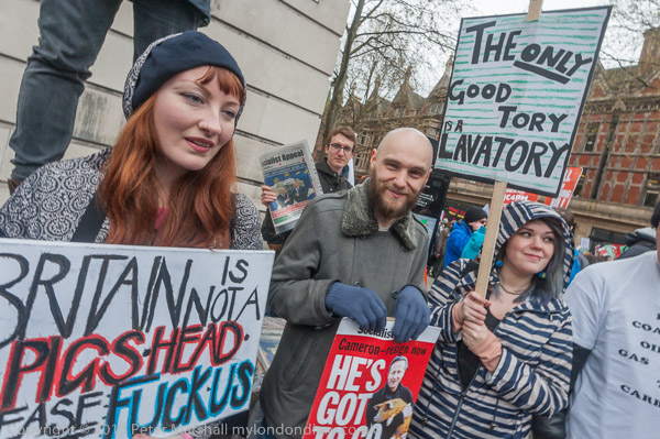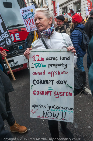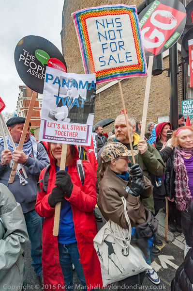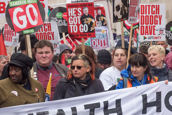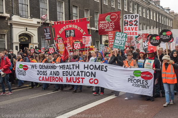 The main People's Assembly banner - 'We demand Health Homes Jobs and Education - Cameron Must Go'