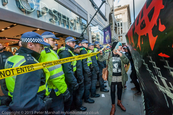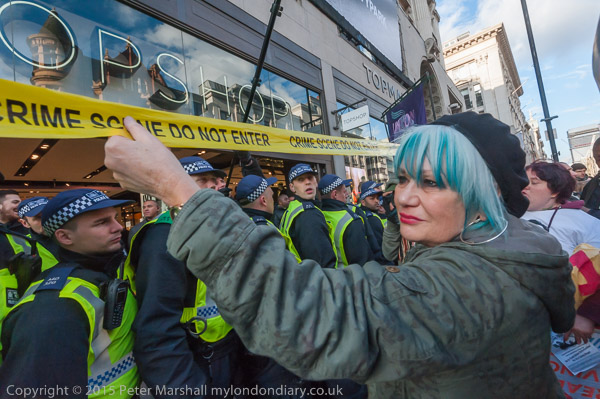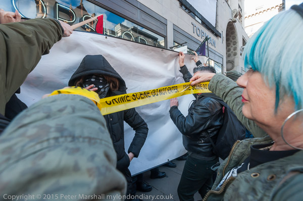 Protesters hold up posters as they face police guarding the side door of Topshop