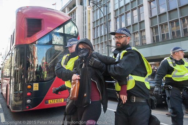 Suddenly, as people were walking away, police grab one protester and drag her across Oxford St