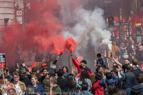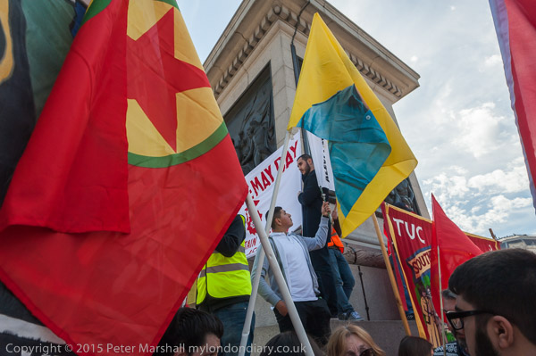 More people climb on to the plinth with their banners. They think the steward is unhinged and unfraternal and