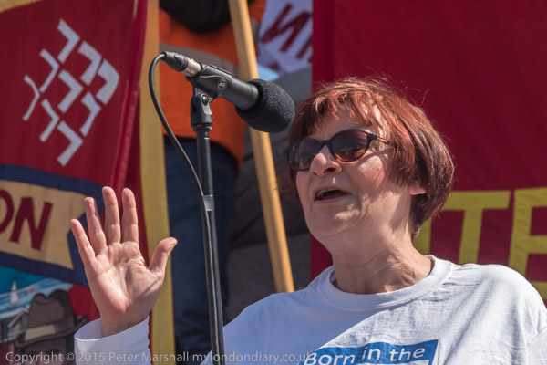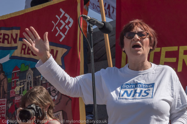 Christine Blower, NUT General Secretary speaking, wearing a 'Born in the NHS' t-shirt. The NUT is supporting the