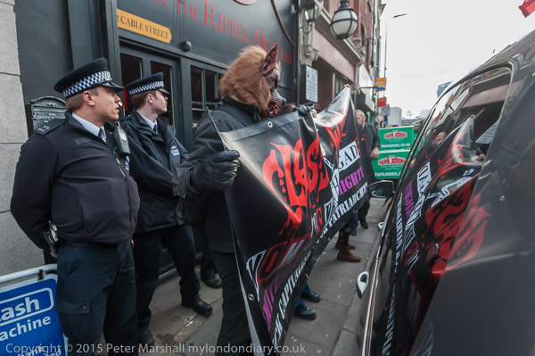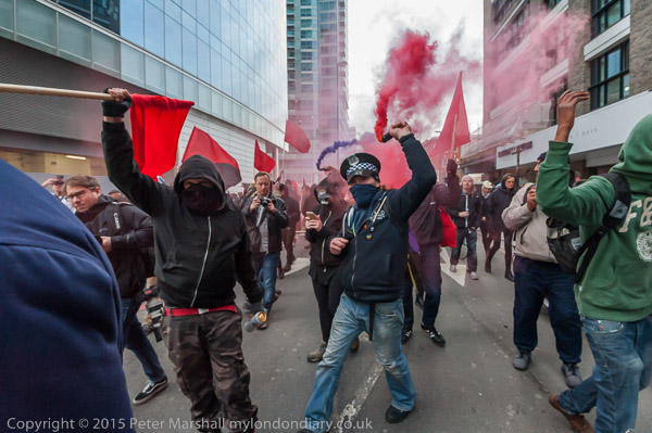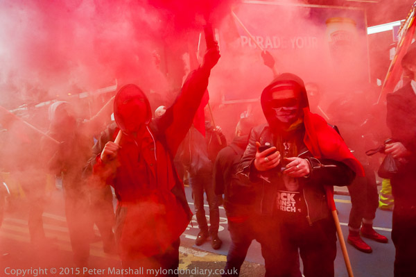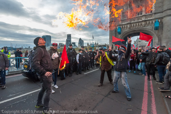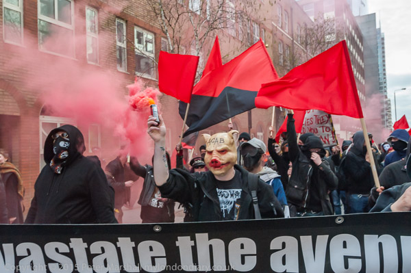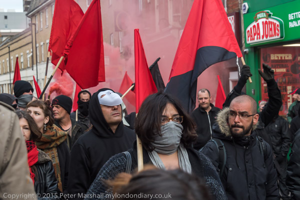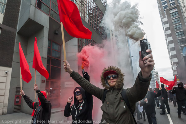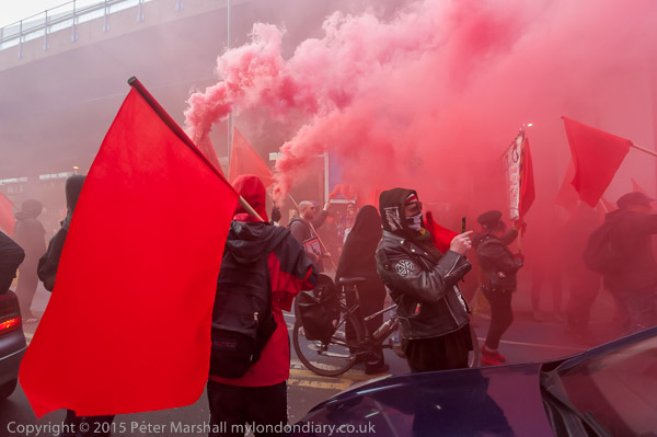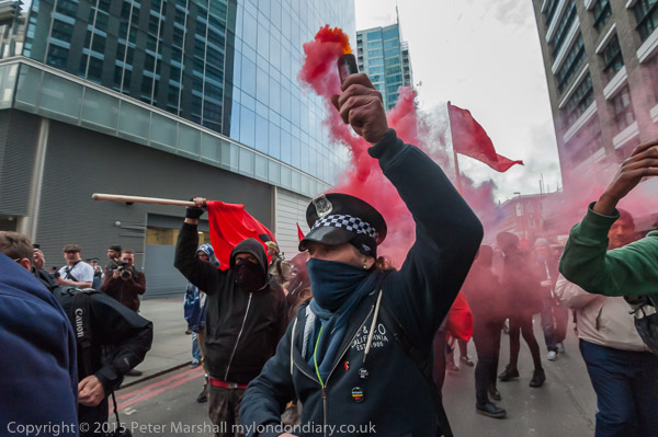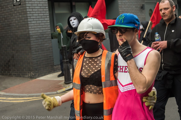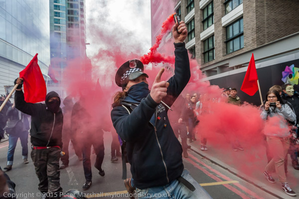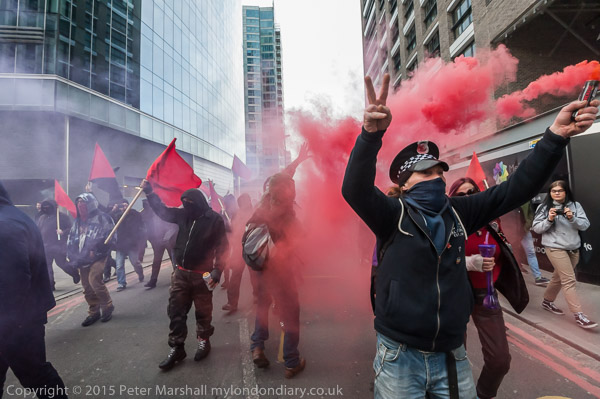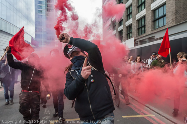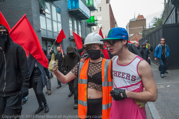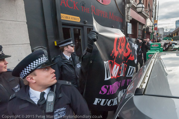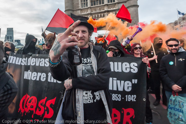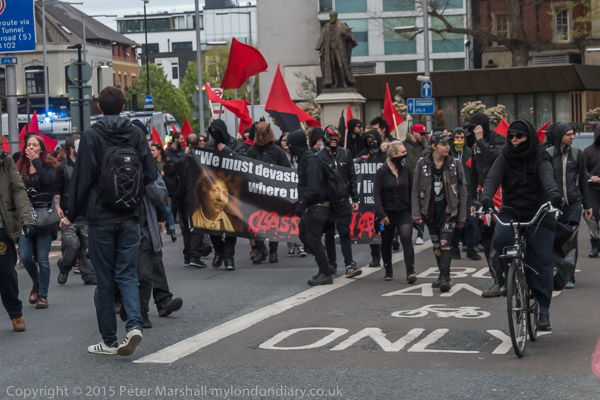 Next to the terrible 'museum' the air stays fairly clearas Class War move with the Womens Death Brigade banner