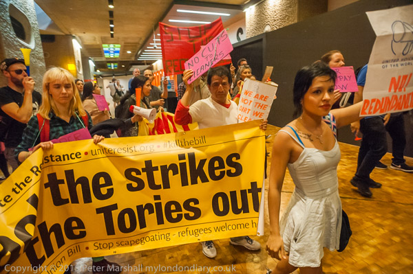 An UVW General Secretary Petros Elia speaks against cutting the cleaners jobs to the people waiting to go in to the concert