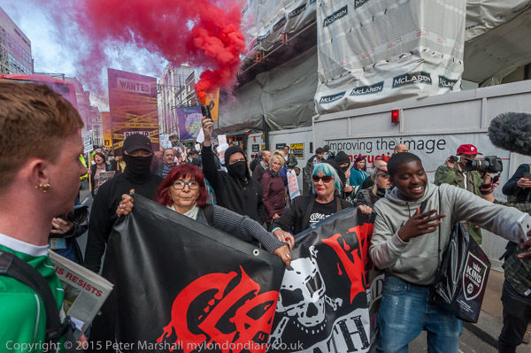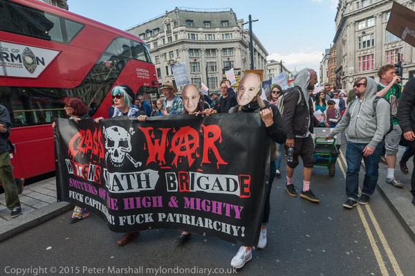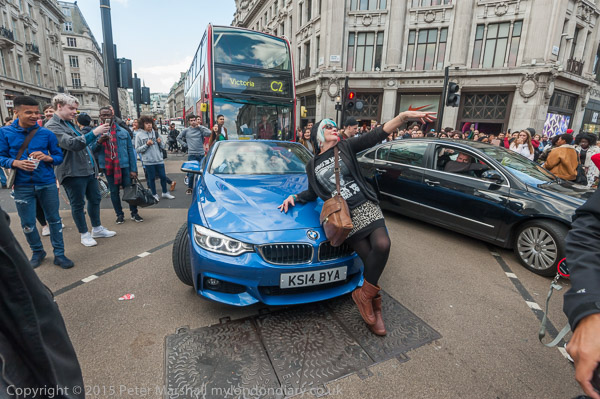 Jane Nicholl of Class War poses on the bonnet of a car which has been stopped by the protest