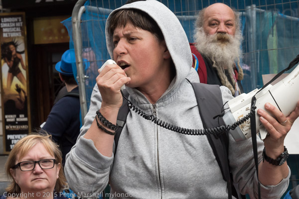 A woman speaks and points at the banner listing just a few of those know to have died because of sanctions and cuts
