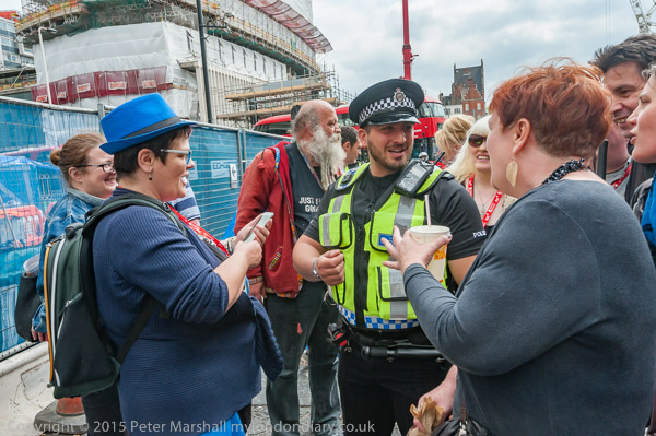 Paula is just getting people to turn around to march back to COngress House when a police officer arrives