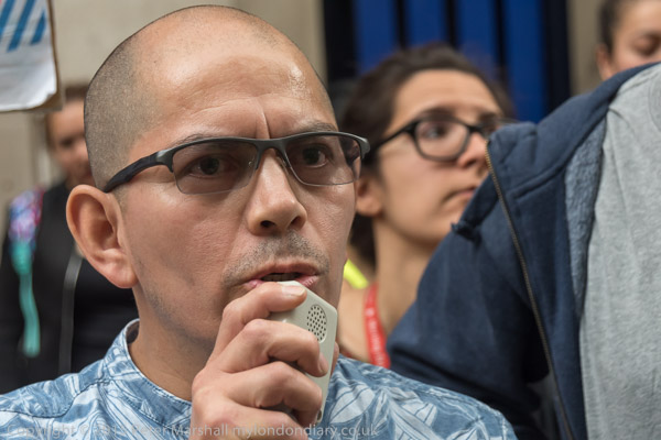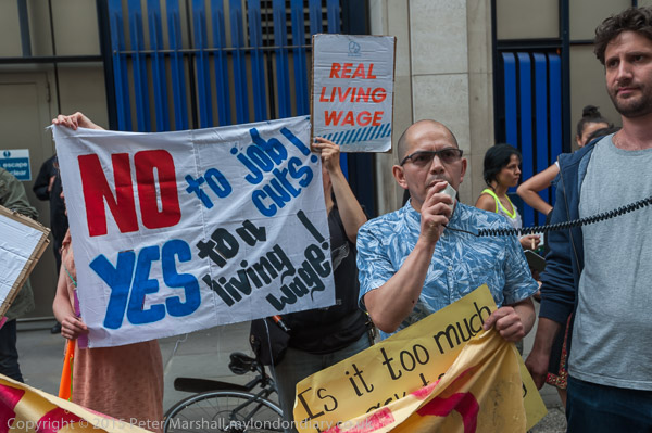 One of the striking cleaners speaks at the protest. 'No to job cuts! Yes to a living wage!'
