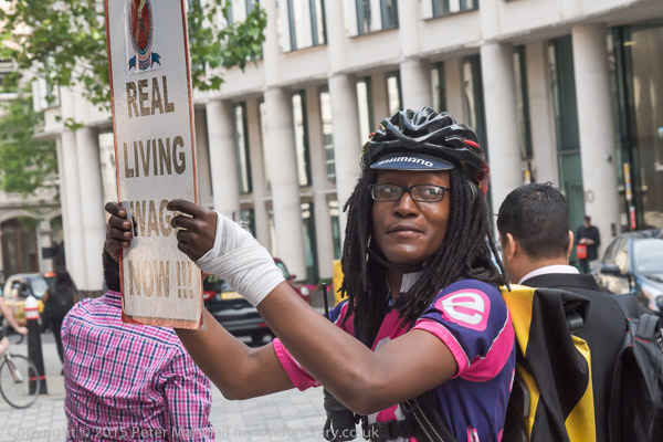 A cyclist takes part in the protest, holding up a poster 'Real Living Wage Now'.