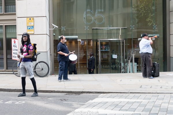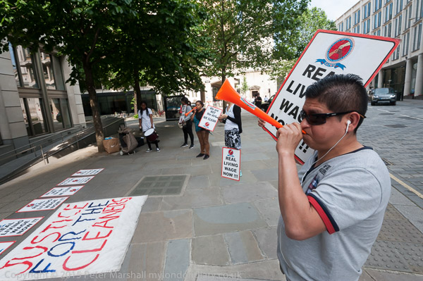 and 'Living Wage Now'. But the protest is also for the re-instatement of sacked African cleaners