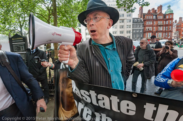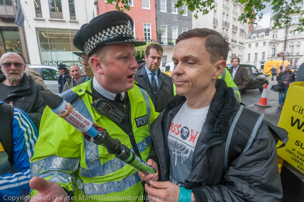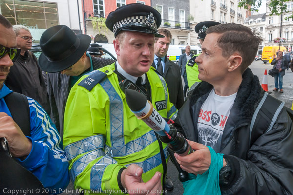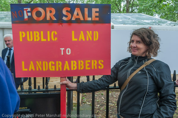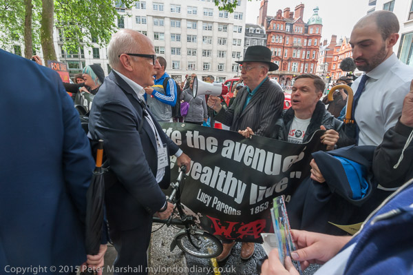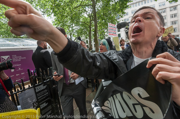 Peter Murray of New London Architecture stops briefly to look at the protest as he leaves the forum