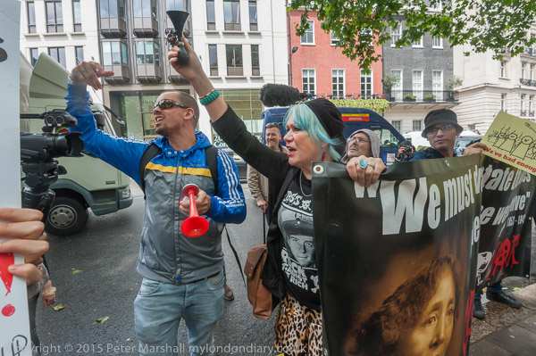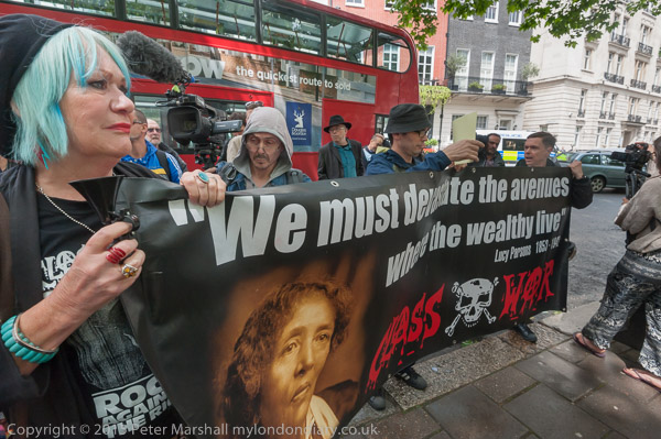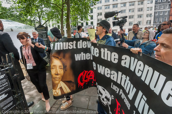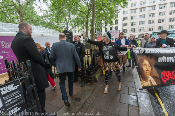 Jane Nicholl of Class War shouts and beeps her horn at people going in to the forum