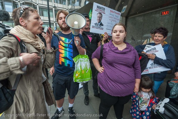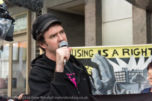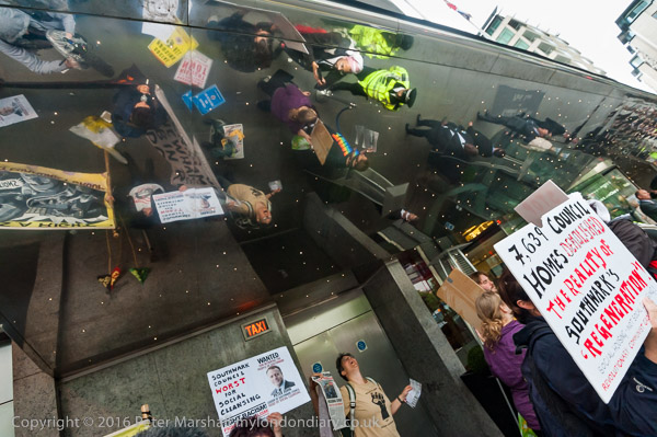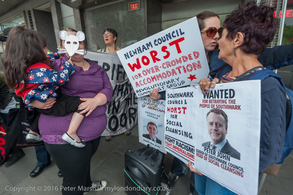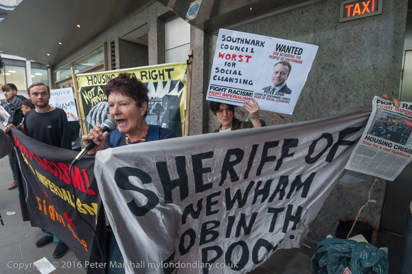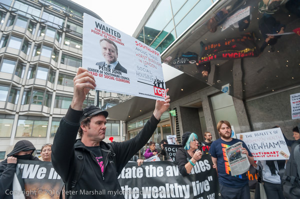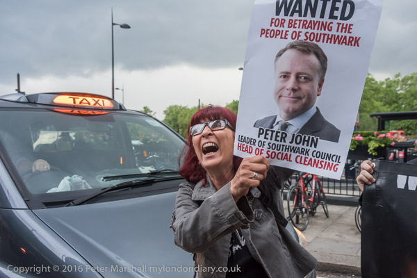 Simon Elmer holds up a poster showing Peter John, Leader of Southwark Council 'Wanted for betraying the people of Southwark'
