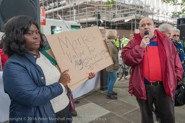 A woman holds a poster 'Market Value for Aylesbury Estate Southwark Council' as David Iles speaks.