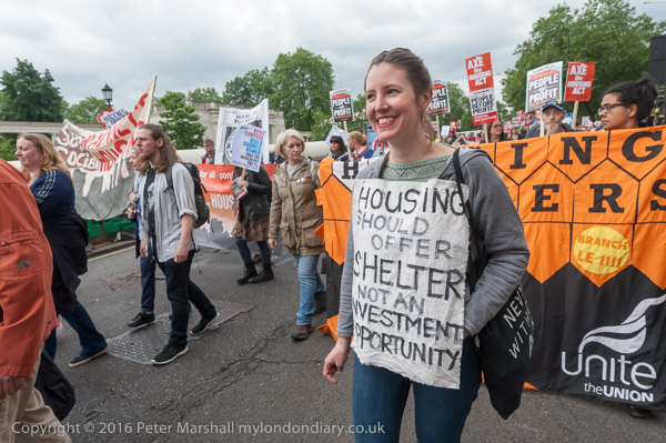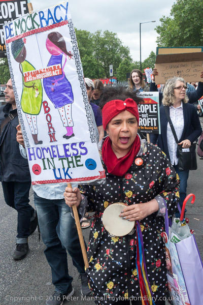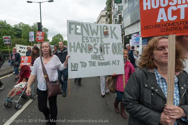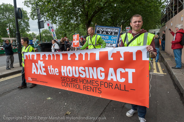 The main banner at the front of the march 'Axe the Housing Act - Secure Homes for all - Control rents'