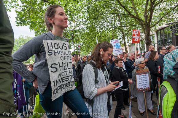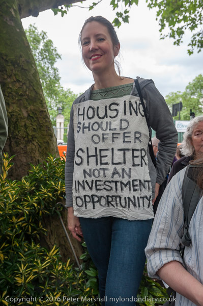 A woman wears a poster 'Housing should offer Shelter not an investment opportunity'