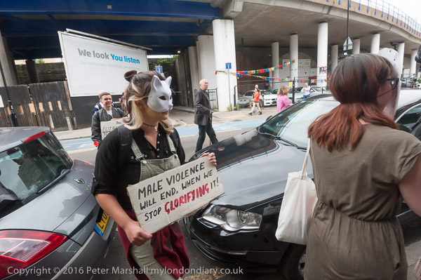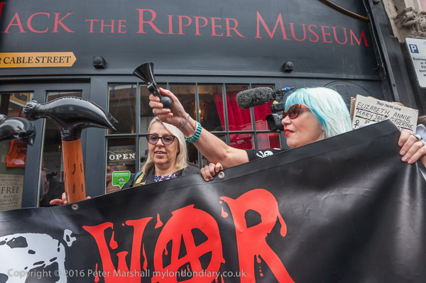 and opposite the shop, the billboard where the advert for the real East End Women's history exhibition was vandalised