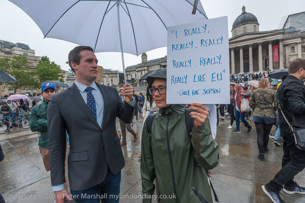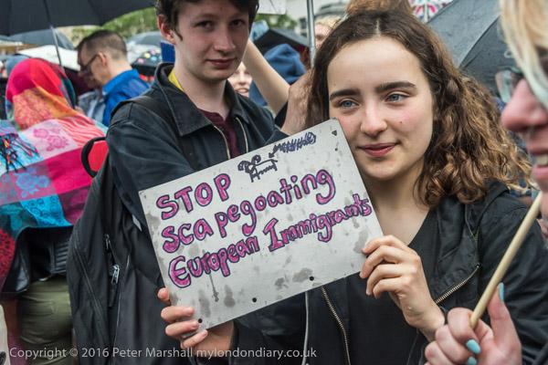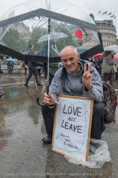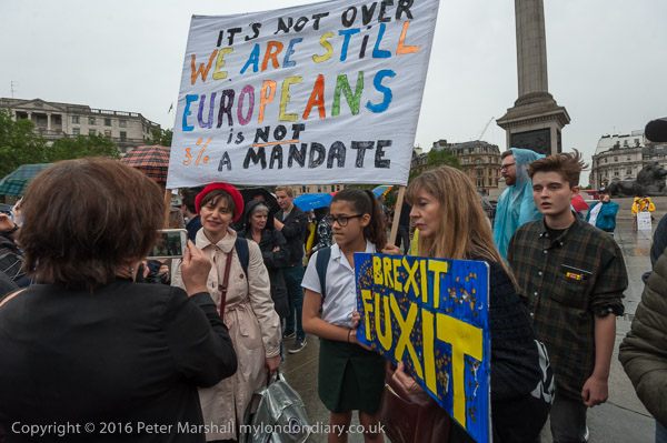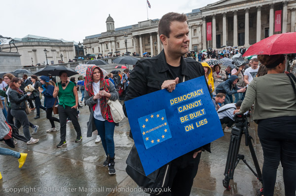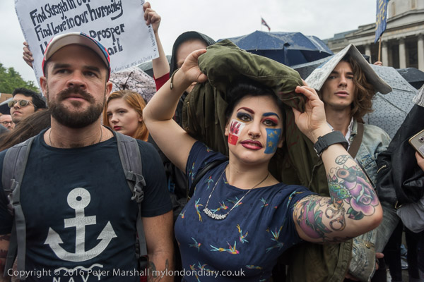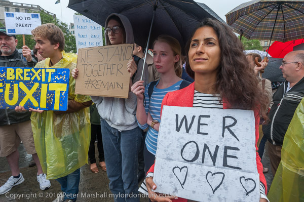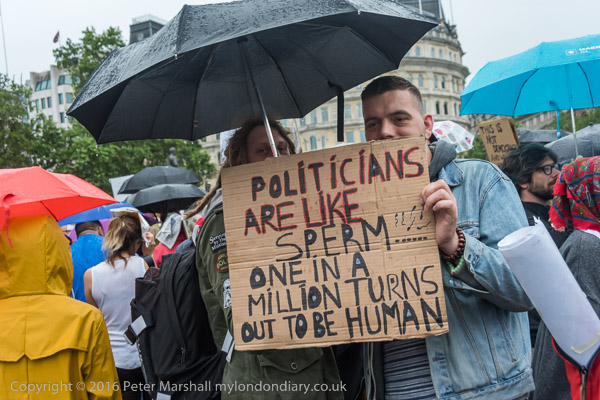 People gather in the rain for a protest after the Brexit vote. Everyone feels cheated as politicians deny the promises