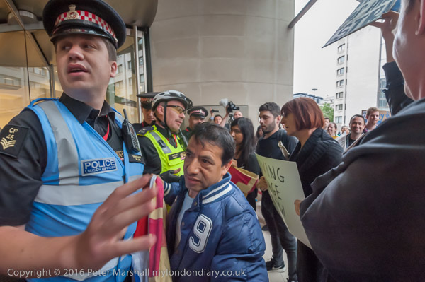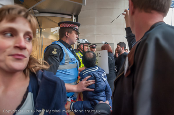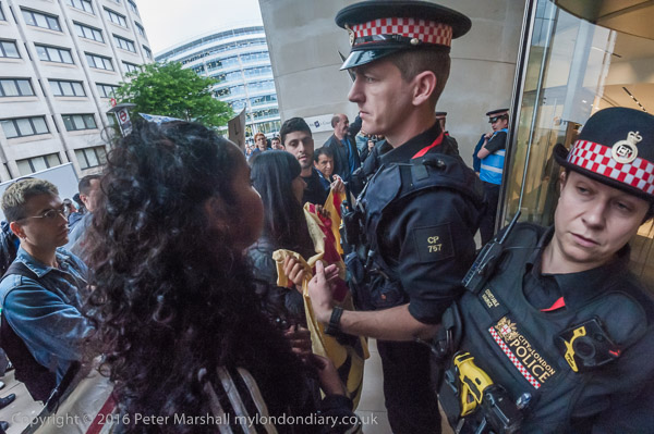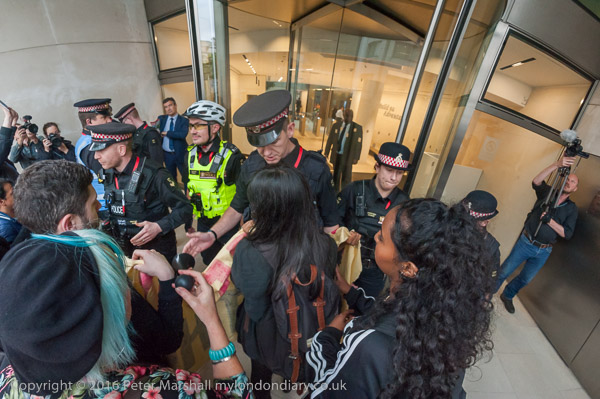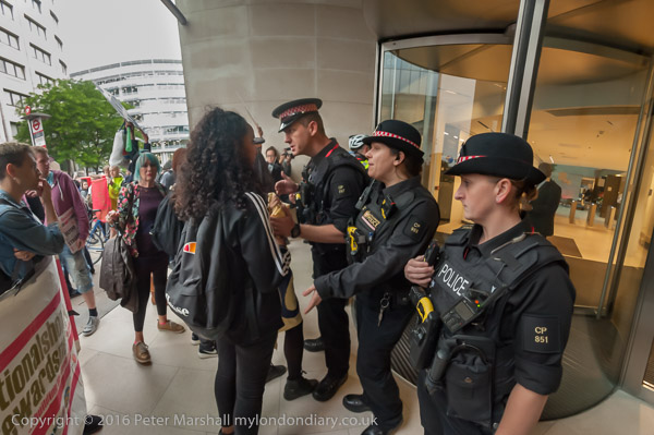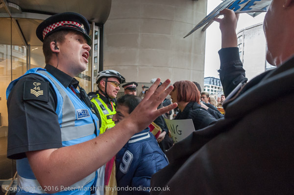 Slowly the police push the protesters away from the doors and back into the street where the protest continues