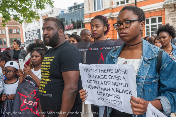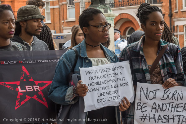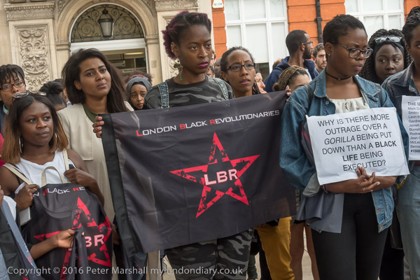 London Black Revolutionaries flag and a good question 'Why is there more outrage over a gorilla being put down than a Black Life being executed?'