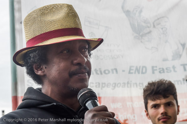 A speaker from the Movement for Justice invites people to protest at Yarl's Woodf in September