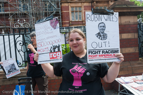 Jasmine Stone holds up a RCG poster - Newham residents suffer £50million cuts. RObin Wales gets £100,000 + £80,000 expenses