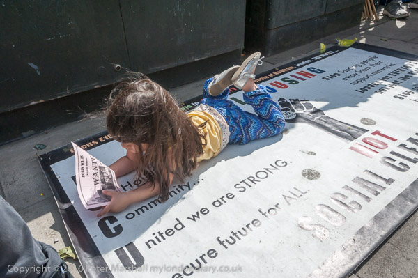 The Focus E15 protesters set up on Barking Rd, outside Newham Town Hall, with posters on its fence about