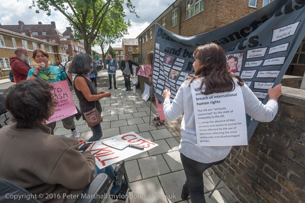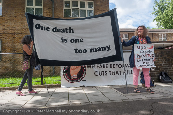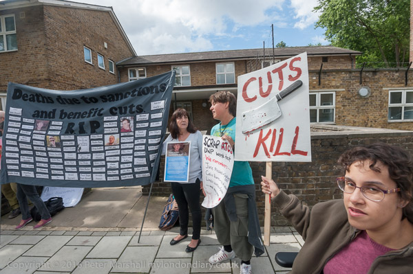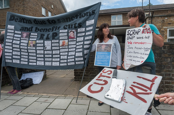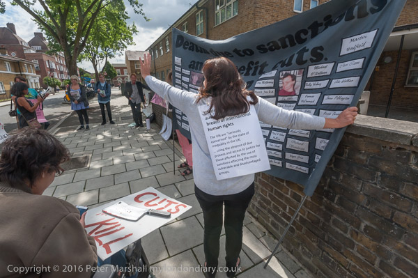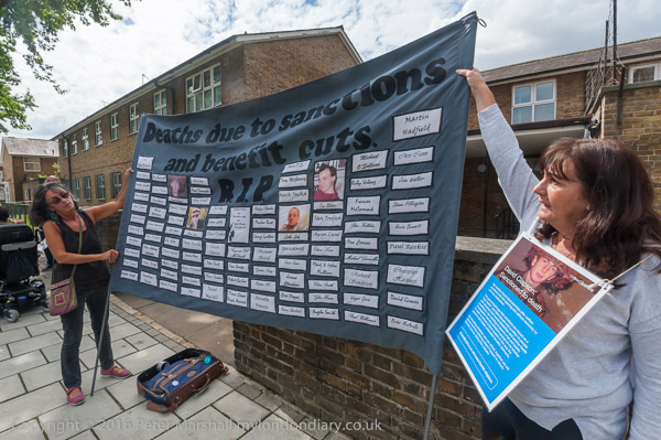 A banner names a few of those who have died due to sanctions and benefit cuts.