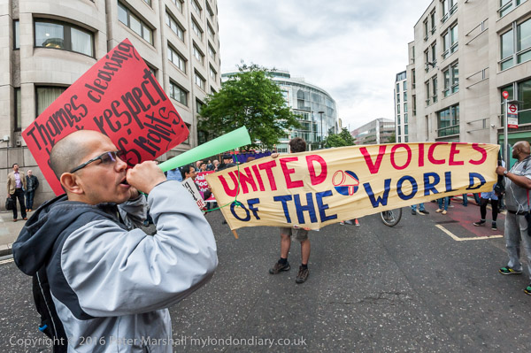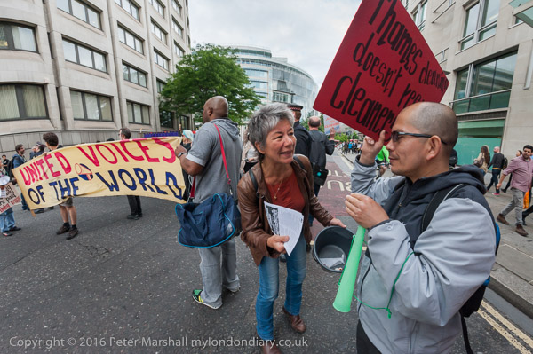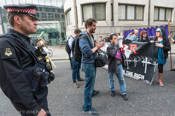 Police try to get UVW General Secretary Petros Elia to move - he tells them they will when the protest finishes in a few minutes