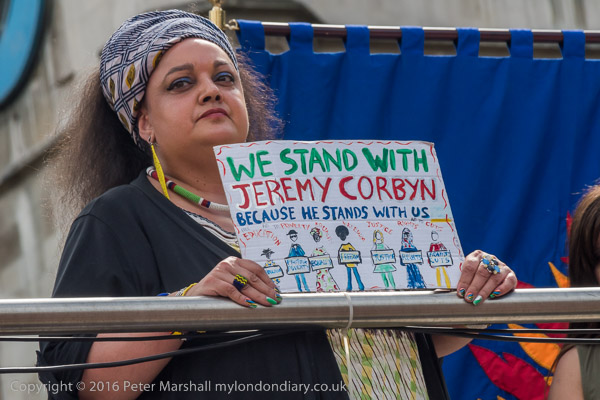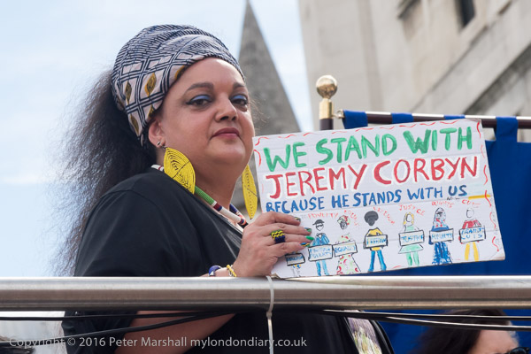 Zita Holbourne of BARAC and PCS holds up her 'We Stand with Jeremy Corbyn' poster