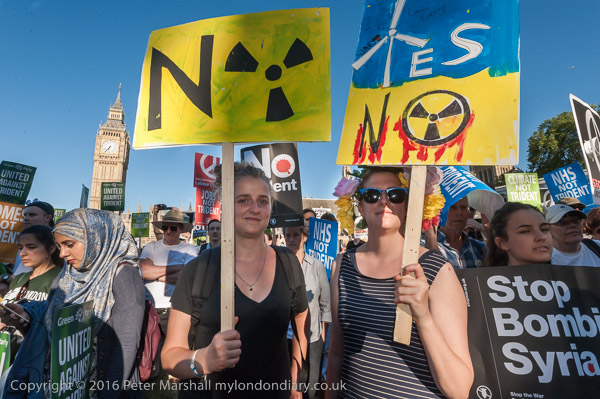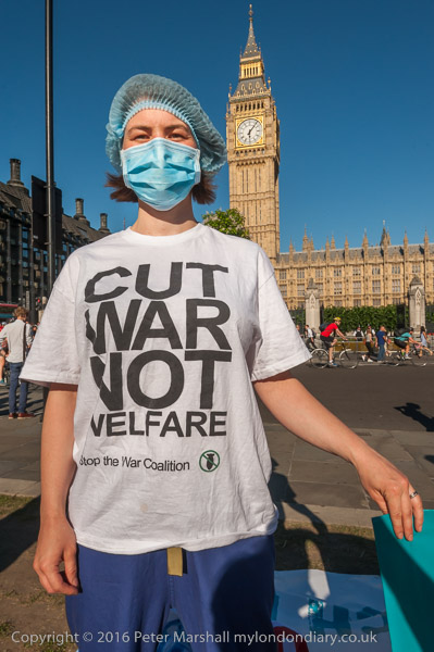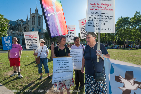 Faith protesters lined up on the edge of the square facing Parliament, including Buddhists from the Battersea Peace Pagoda