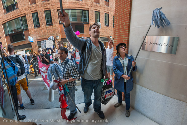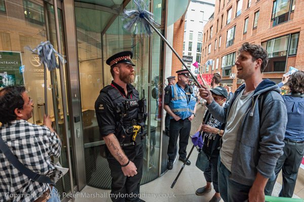 The protest pauses briefly on the road close to the front entrance of the CBRE offices in St Martin's Court