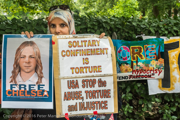 The London Guantánamo Campaign protest at the US Embassy and Marble Arch calling for the release of the remaining 76 prisoners still held in the prison camp and in solidarity with Chelsea Manning who faces lengthy solitary confinement after her suicide attempt last month.