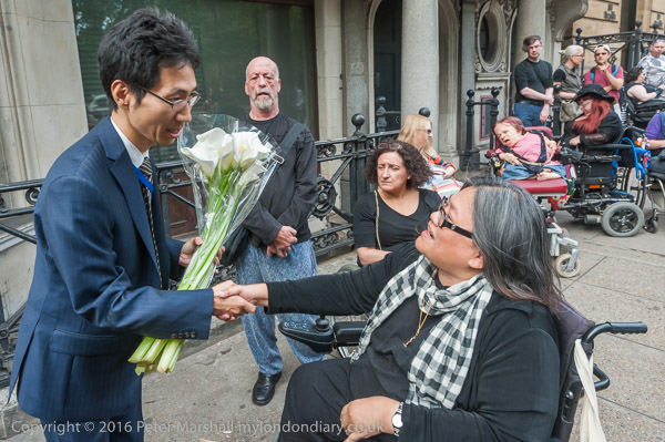 Disabled people and supporters from DPAC, Inclusion London and People First hold a vigil outside the Japanese embassy in London to mourn disabled brothers and sisters murdered in a care home at Sagamihara near Tokyo for being disabled.