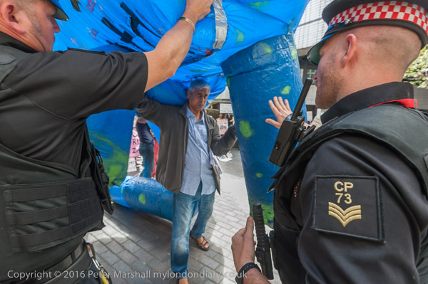 After some argument, they moved onto the public open space of Jubilee Gardens, where they were than harassed by 'South Bank Patrol' Enforcement Officers who told them they were not allowed to protest there. The patrol is a private security force employed by the South Bank Employers Group which has recently been granted limited police powers through the Community Safety Accreditation Scheme.